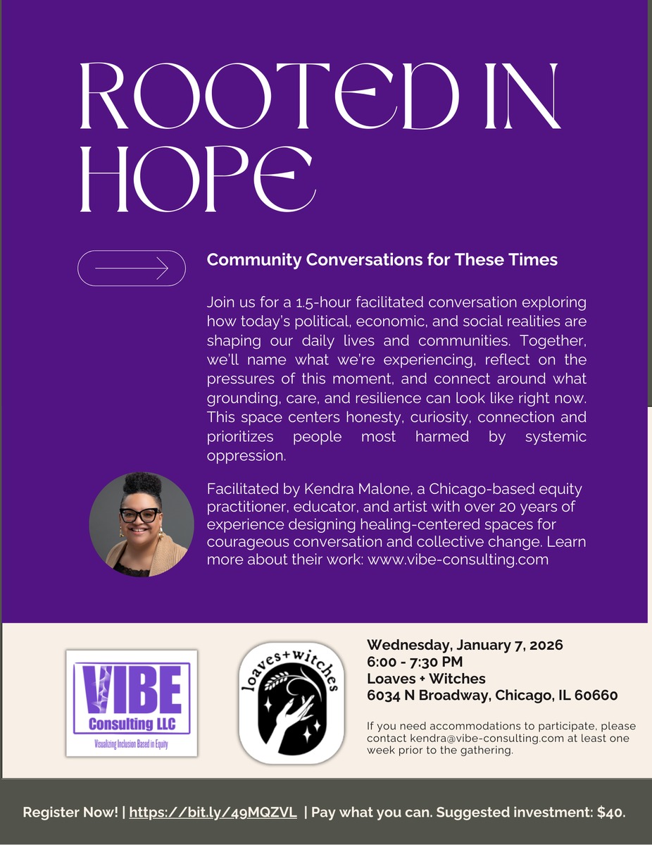 Join us for a 1.5-hour facilitated conversation exploring how today's political, economic, and social realities are shaping our daily lives and communities. Together, we'll name what we're experiencing, reflect on the pressures of this moment, and connect around what grounding. care, and resilience can look like right now. This space centers honesty, curiosity, connection and prioritizes people most harmed by systemic oppression. Facilitated by Kendra Malone, a Chicago-based equity practitioner, educator, and artist with over 20 years of experience designing healing-centered spaces for courageous conversation and collective change. Learn more about their work: www.vibe-consulting.com